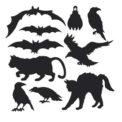 Create a eerie Halloween display with these shadowy bat, cat and raven cutouts.