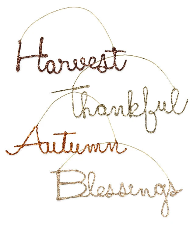 Create a memorable atmosphere for your fall celebrations with gratitude glittered cursive wire word ornaments.