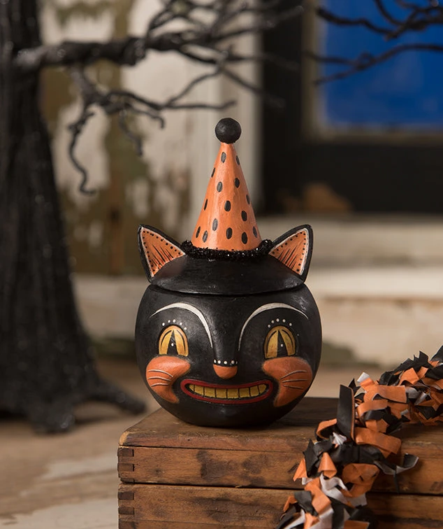 Kick off Halloween with Grinning Vinny Cat Container designed by artist Johanna Parker.