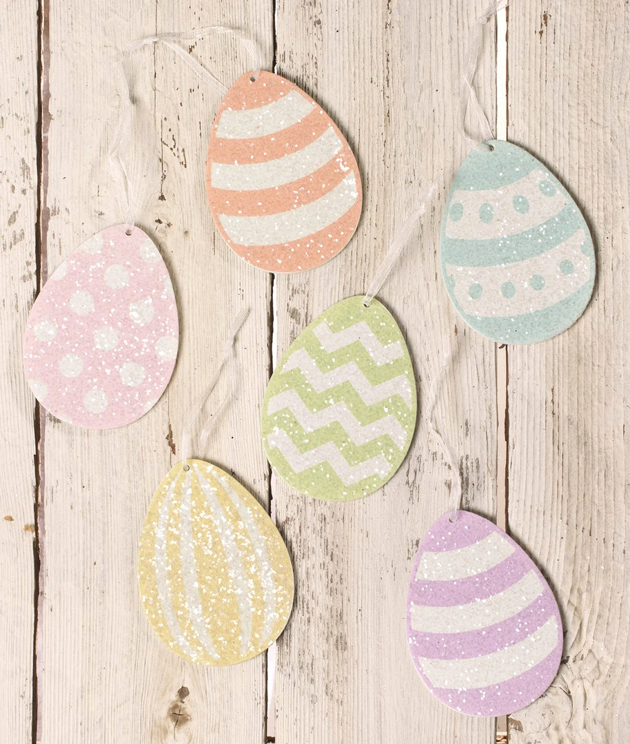 Light-weight paper egg ornaments in fun patterns sprinkled with glitter.