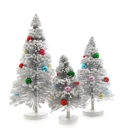 Let the fun begin! Add a festive touch to your Christmas decor with these snowy silver bristle trees decorated with brightly colored ornaments.