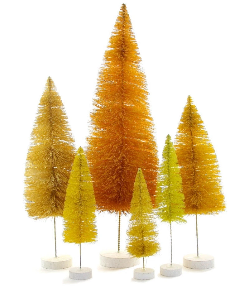 Create a stylish holiday vignette with these textural shades of Yellow Bottle Brush trees that come in various sizes.