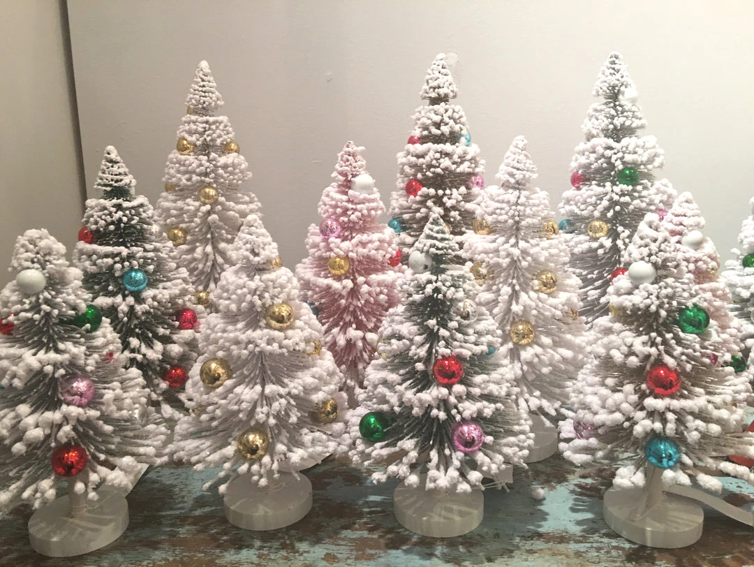 Create a beautiful holiday scene with these White Flocked Bottle Brush Trees with Gold Decorations.