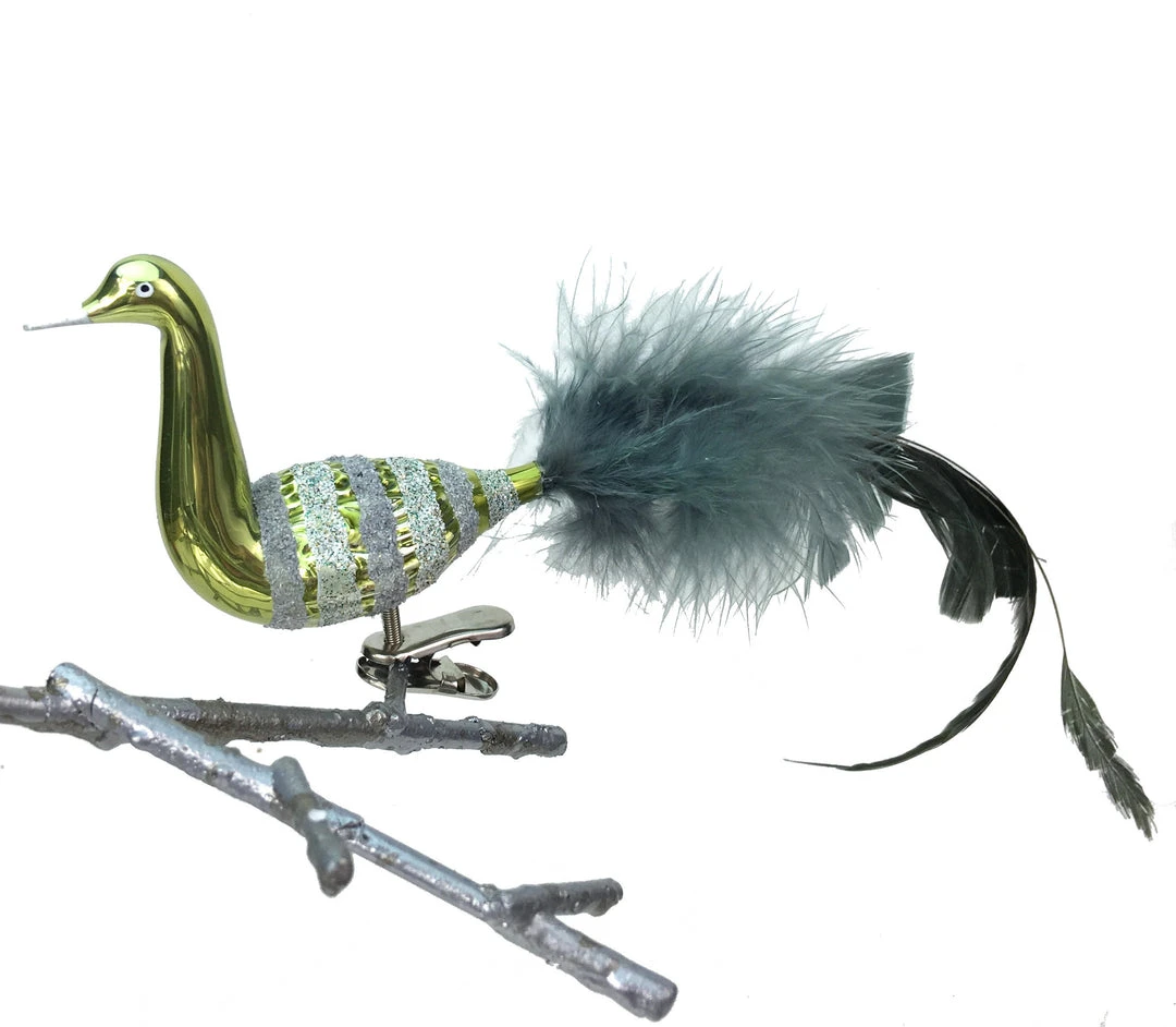 - Mouth-blown glass clip-on bird ornament with feathers.