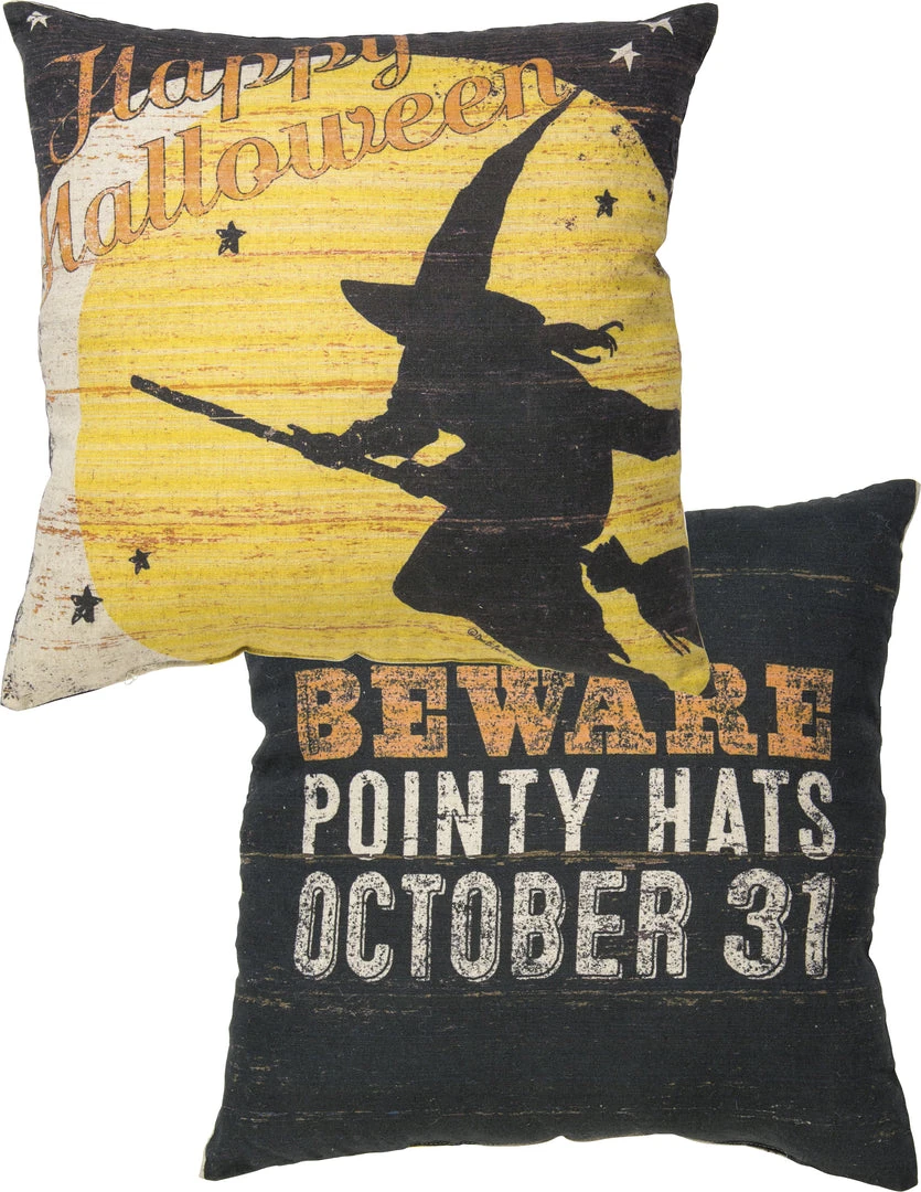Beware of Pointy Hats on October 31st.! Create a spellbinding effect on your chair or couch with this Happy Halloween Flying Witch Pillow.