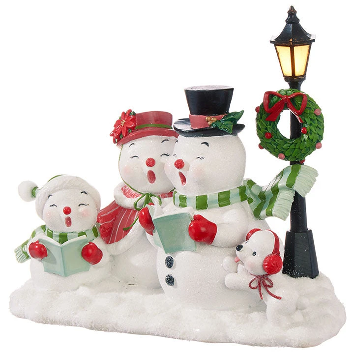Create an amusing holiday scene with this caroling snowman family with a lighted lamp post.
