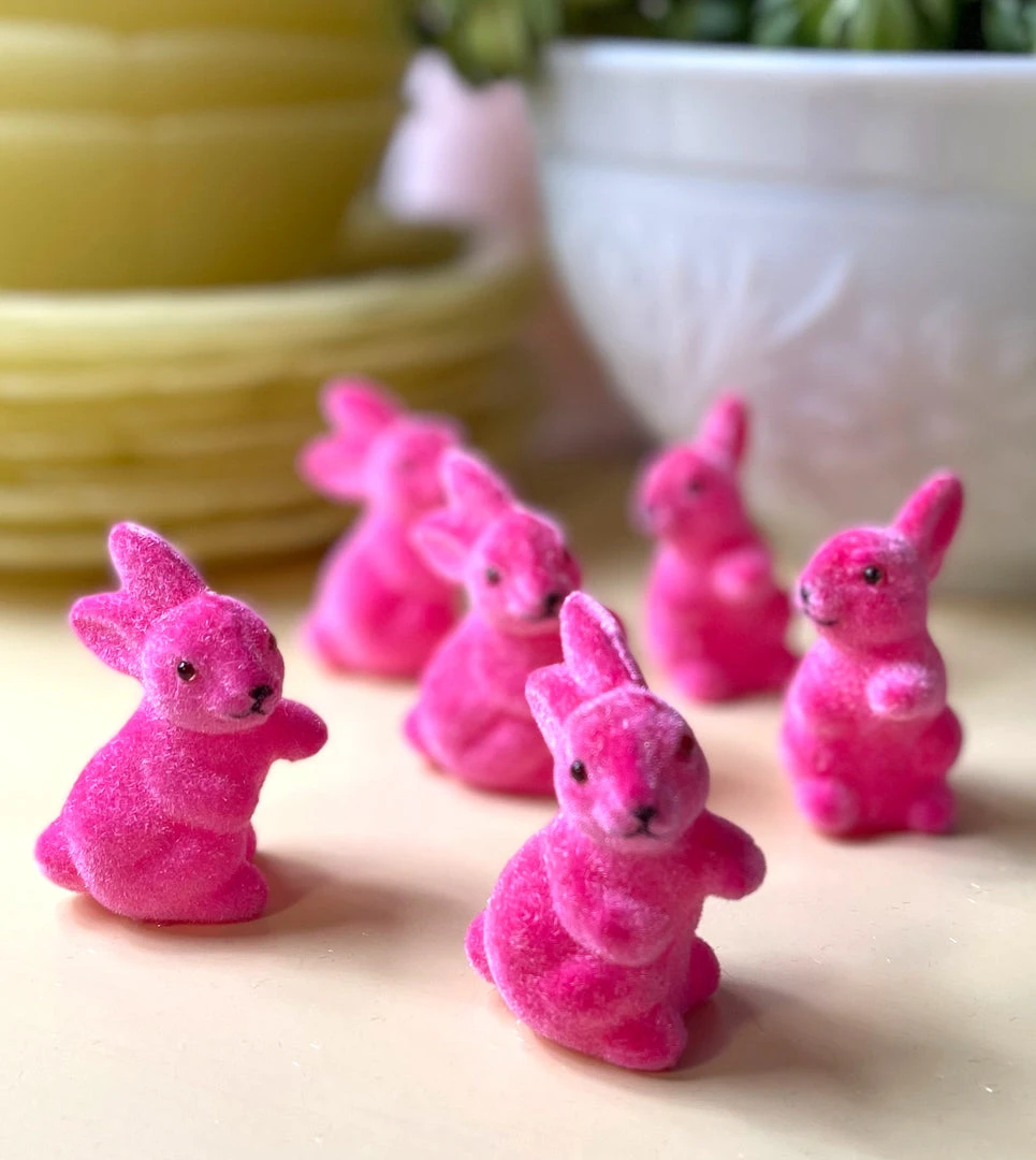 Add a pop of color to your Easter decor with these small Bright Pink Flocked Bunny Rabbits.